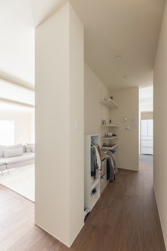 「もっと広く、のびのび過ごしたい」という願いを、構造から見直すことで叶えました。柱の数を最小限にすることでキッチンから窓まで視線がスッと抜け、実際の広さ以上の開放感を感じられます。家族の気配を感じながらも、それぞれがゆったりと寛げる、心地よい距離感のデザインです。
