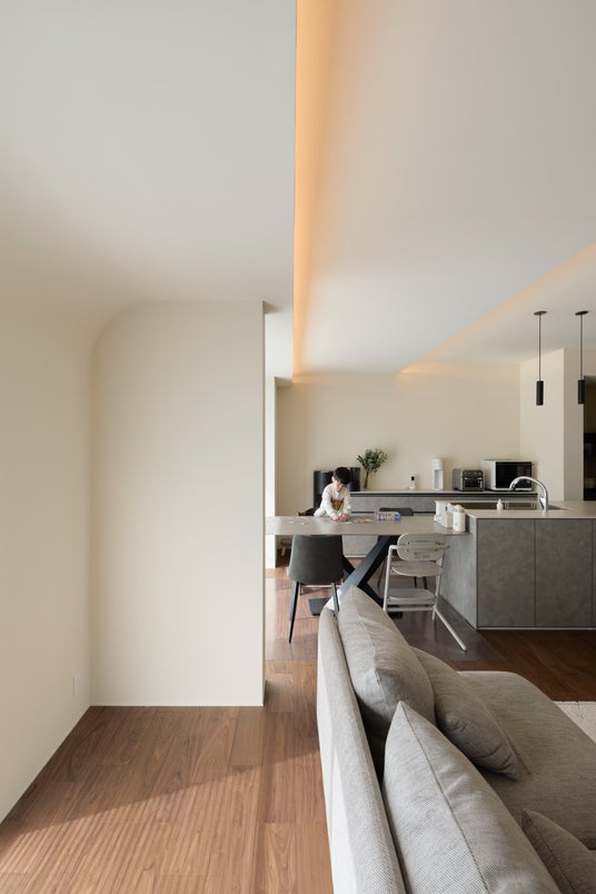 「ダウンライトは使わない」というこだわりから、天井そのものを「光の器」とするR天井を採用。緩やかなカーブを描く天井から、柔らかな光が部屋全体を包み込みます。まるでホテルのような、落ち着きのある空気感が広がります。