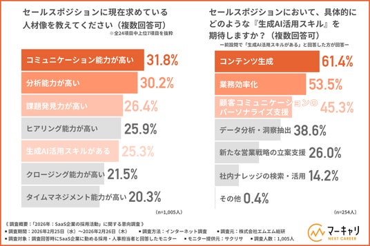 最後に「セールスポジションにおいて、具体的にどのような『生成AI活用スキル』を期待するか」について尋ねたところ、『コンテンツ生成(メール、提案書、スクリプトなど)(61.4%)』と回答した方が最も多く、『業務効率化(情報収集、タスク自動化など)(53.5%)』『顧客コミュニケーションのパーソナライズ支援(45.3%)』と続きました。