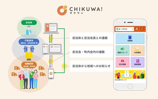 「CHIKUWA!」は、自治会・町内会運営のデジタル化を支援する連絡ツールとして、自治体と自治会・町内会間における情報共有をはじめ、電子回覧板やアンケート、グループ掲示板など、団体運営に必要な機能を提供してきました。