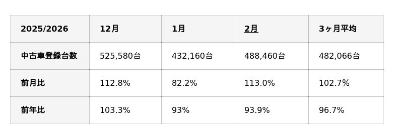 【中古車市場統計レポート(2026年2月)】より抜粋してご案内いたします。