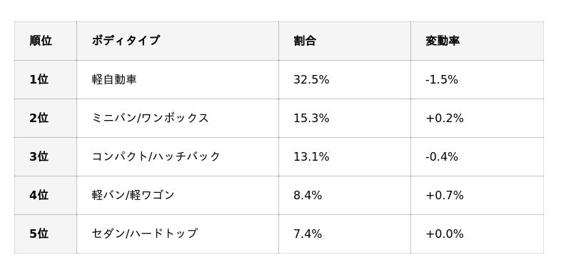 国産車のボディタイプ別ランキングでは、軽自動車が1.5ポイントほどシェアを落としたものの、1位を維持しています。一方、軽バン/軽ワゴンは0.7ポイントの増加を見せており、軽自動車全体のシェアが下落する中で、実用性の高いタイプへの根強い需要が伺える結果となりました。