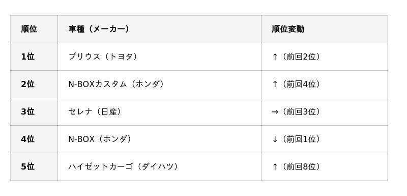 国産車の車種別ランキングでは、先月2位だったプリウス(トヨタ)が首位に浮上しました。また、先月は圏外だったハスラー(スズキ)が8位に急上昇し、ランクインを果たしています。