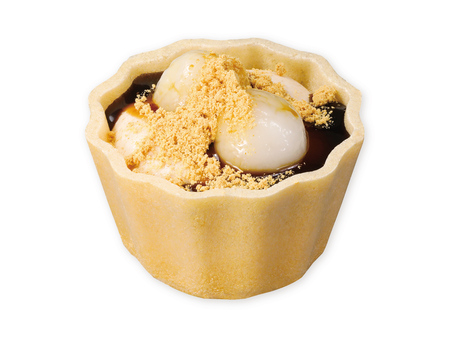 最中でできたカップに、きなこと黒蜜と相性の良いパンナコッタが入った和スイーツ。北海道産きなこを使用した香ばしいきなこクリームに、波照間産黒糖を使ったコク深い黒蜜、もちもちの白玉をトッピングし、やさしい甘さと食感の変化を楽しめる一品に仕上げました。最中を少しずつ崩しながら食べ進めることで、味も食感も変化し、最後まで飽きずに楽しめます。