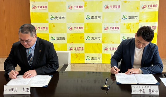 協定書に署名する横川海津市長と当社 取締役副社長・中森