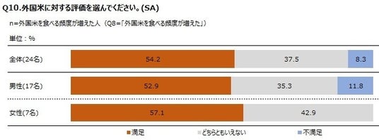 米価高騰を受けて、外国米を食べる頻度が増えた人は24名(全体の4.8%)と少数に留まったが、その外国米に対する評価は、「満足」が54.2%、「どちらともいえない」が37.5%であり、「不満足」は8.3%に留まった。許容の評価が9割以上を占めており、明らかな不満は1割未満と少なかった。