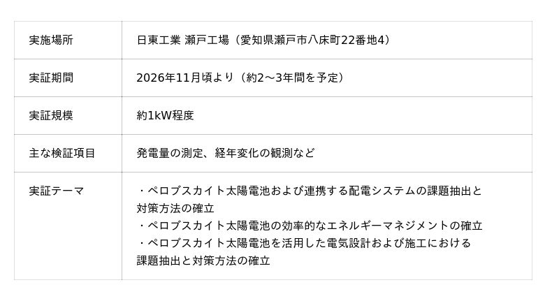 日東工業株式会社(本社:愛知県長久手市、取締役社長 黒野 透、以下 日東工業)は、愛知県が推進する「ペロブスカイト太陽電池(※)普及拡大プロジェクト」において、2026年度の実証事業を実施するフィールドとして応募した当社瀬戸工場での実証提案内容が評価され、実証フィールドとして選定されましたのでお知らせいたします。