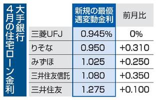 三菱UFJ銀行など大手5行は31日、4月に適用する住宅ローン金利を発表した。契約者の多くが選ぶ変動型の最優遇金利を4行が引き上げた。うち3行は節目の1%を超えた。昨年12月に日銀が決めた政策金利の引き上げなどを踏まえた。