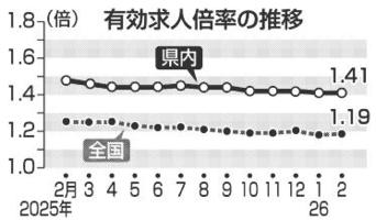 県内有効求人1.41倍 2月、前月から横ばい 経済 2026年4月1日 05:00 岐阜労働局が31日発表した2月の... 残り598文字(全文:615文字) この記事をお読みいただくには「デジタルプラン」または「宅配+デジタルプラン」の会員登録が必要です。無料会員の方はログインしてマイページからコース変更してください。デジタルプランまたは宅配+デジタルプランをご登録中の方はログインしてください。 岐阜新聞デジタル会員に登録すると 無料会員向け記事が読める ニュースレターで最新情報が受け取れる デジタルプラン、宅配+デジタルプランなら Webオリジナルコンテンツが読める 紙面ビューアが読める チケットの先行発売に参加できる お得なクーポンが使える 新規登録ページ ログインページ トップ 岐阜のニュース 経済 県内有効求人1.41倍 2月、前月から横ばい 関連記事 カネ井青果、3ヵ所目の低温物流施設開設 需要増に対応 アレンザのTOB成立 バローHD子会社、上場廃止へ 代替エビで総菜 イビデン物産が開発 植物性素材が主原料 岐阜信金「プラチナくるみん」 厚労相認定 仕事と子育て両立 飛騨信用組合人事 JAひだ人事 おすすめ記事 岐阜県在住外国人、この10年で何が変わったのか データで分析 あなたの町で起きていること 飛騨市の広報、上田さんが全国表彰で最高賞 活性化施策を効果的にPR FC岐阜、15歳とプロ契約 海津市出身の山川選手、クラブ史上最年少 JR坂祝駅の旧駅舎、加茂高の美術部員が模型を制作 貨物輸送があった時代を再現 4月2日から展示