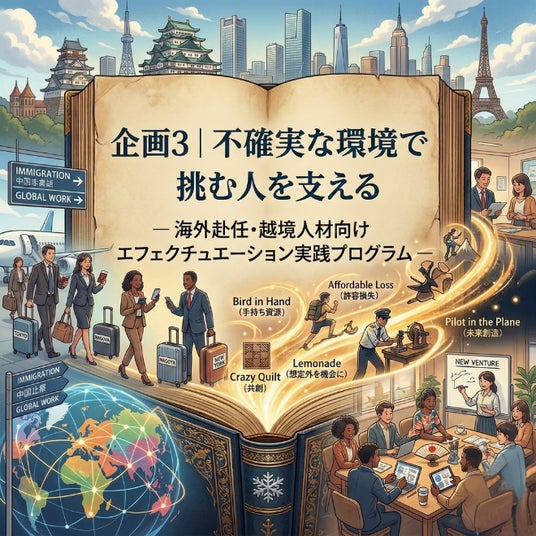 企画3| 不確実な環境で挑む人を支える― 海外赴任・越境人材向け エフェクチュエーション実践プログラム ―海外赴任や新規事業、異文化環境では、日本で通用していた前提が崩れる場面が多くあります。「事前計画通りに進める」だけでは立ち行かない環境で、手持ち資源の棚卸し・想定外を前提にした意思決定トレーニング・ケース教材による対話型学習など、不確実性の中で価値を創り出す力を育てる実践的なプログラムを開発します。