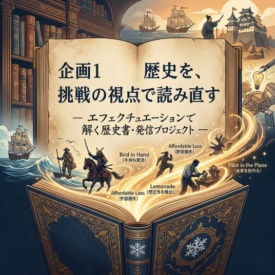 企画1|歴史を、挑戦の視点で読み直す― エフェクチュエーションで読み解く歴史・発信プロジェクト ―歴史上の偉人たちは、最初から未来を見通していたわけではありません。不確実な状況の中で、自分が持っているものを起点に動き、人を巻き込み、偶然を味方につけながら道を切り拓いてきた人たちです。「勝者の予測力」ではなく「不確かな中での一歩」として歴史を読み直すとき、エフェクチュエーションは歴史教育の新しい視点になれます。