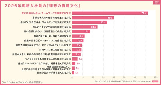5. 理想の職場文化、「互いに協力し合い、チームワークを重視する文化がある」が72.6%でダントツ