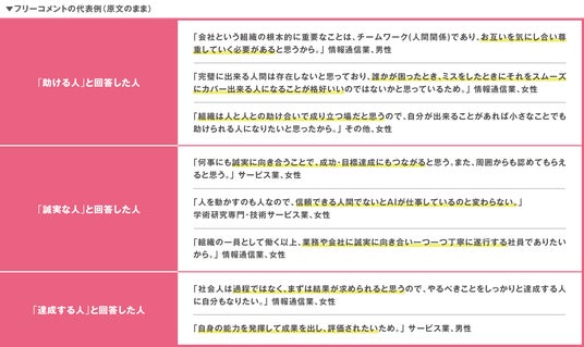 こうした不安を背景に、新入社員が理想とする仕事スタイルは「安定重視」が最も多く、無理に挑戦するよりも、できることを着実に積み重ねていく働き方を志向する傾向が見られました。また、理想の社会人像では「助ける人」が2年連続で1位となり、「誠実な人」が昨年より順位を上げて2位に浮上しました。自由記述からは、成果やスピードよりも、周囲への配慮や信頼関係、組織の一員として誠実に行動する姿勢を重視する価値観が強く表れていました。