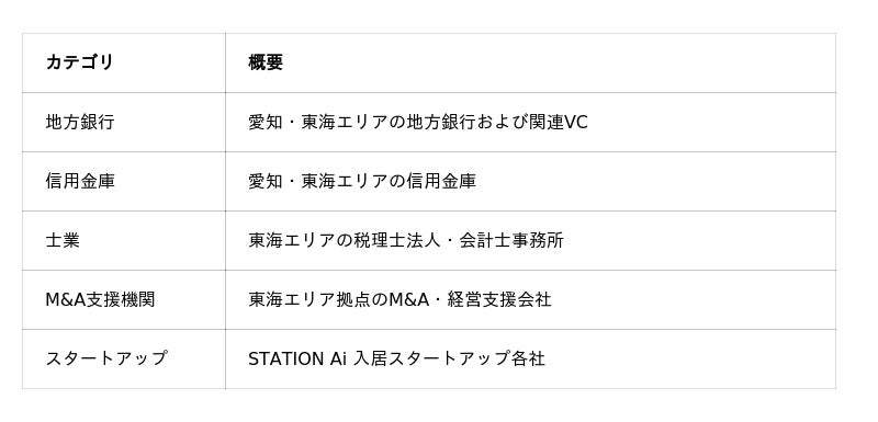 STATION Aiには、東海地域の金融機関・VC・信用金庫・士業・スタートアップが多数入居しており、M&Aナビはこのエコシステムを最大限に活用した連携強化を図ります。