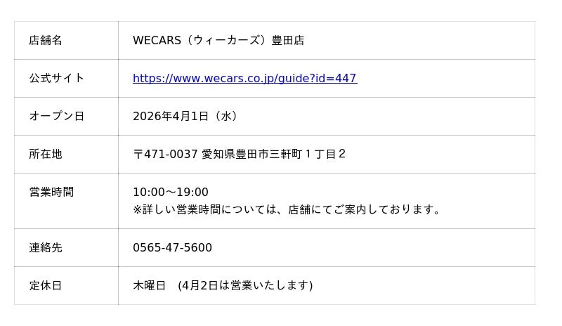 株式会社WECARS(本社:東京都千代田区、以下「WECARS」)は2026年4月1日(水)、愛知県豊田市に「WECARS豊田店」を新たに出店します。