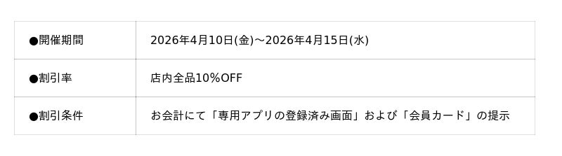 お会計にてアプリの登録済み画面、もしくは会員カードのご提示で10%OFFの対象となります。