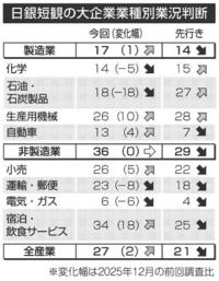 大企業景況感先行き悪化 原油高の長期化懸念 日銀3月短観 2026年4月2日 05:00 日銀が1日発表した3月の企業短期... 残り816文字(全文:833文字) この記事をお読みいただくには「デジタルプラン」または「宅配+デジタルプラン」の会員登録が必要です。無料会員の方はログインしてマイページからコース変更してください。デジタルプランまたは宅配+デジタルプランをご登録中の方はログインしてください。 岐阜新聞デジタル会員に登録すると 無料会員向け記事が読める ニュースレターで最新情報が受け取れる デジタルプラン、宅配+デジタルプランなら Webオリジナルコンテンツが読める 紙面ビューアが読める チケットの先行発売に参加できる お得なクーポンが使える 新規登録ページ ログインページ トップ 岐阜のニュース 大企業景況感先行き悪化 原油高の長期化懸念 日銀3月短観 関連記事 おむすびカフェ、定番ツナマヨやキムクリチーなど限定も 美濃加茂市【記者オススメ! ギフテン】 ベイ今季初勝利 ★独立リーグが名称変更 きのうのプロ野球 ★セ・リーグが日程追加 竜9年ぶり開幕5連敗 おすすめ記事 【速報】岐阜市のコンビニ強盗、容疑の男逮捕 愛知県警に出頭 飛騨牛、成田と羽田空港JAL国際線ラウンジに初採用 外国人客に大人気 追立涼子さん死去 更生保護活動に尽力、藍綬褒章 人工芝グラウンド完成 可児市運動公園、4日にスポーツマルシェ