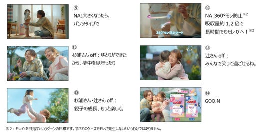 「グーン モレ0(ゼロ)へ」シリーズは、「想定外のハプニング」や「パパ・ママの困った!」といったおむつ替えの負担を軽減することで、心にゆとりをもたらします。そのゆとりが、赤ちゃんの小さな成長を見逃さず、親子の時間をもっと楽しくしてくれる――。本CMは、そんな「グーンなら、できちゃう!」世界観を表現しています。