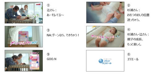 今回のCMでは、ベビー用紙おむつ「グーン モレ0(ゼロ)へ」シリーズを通して、多くの方が感じているおむつに関する悩みを軽減し、赤ちゃんだけではなくパパ・ママも成長を感じられることで、毎日の育児がもっと楽しくなる様子を描いています。