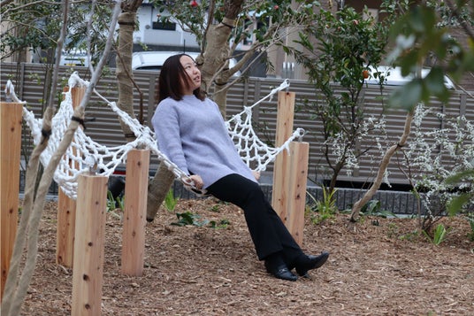 敷地内には、木々のざわめきを感じられるリフレッシュエリア「ちょい森」を整備。ネット状のベンチに身を預け、自然の中で業務の合間に思考をリセットできる場所です。100億という高い目標へ挑み続けるための「心の余白」をデザインしています。
