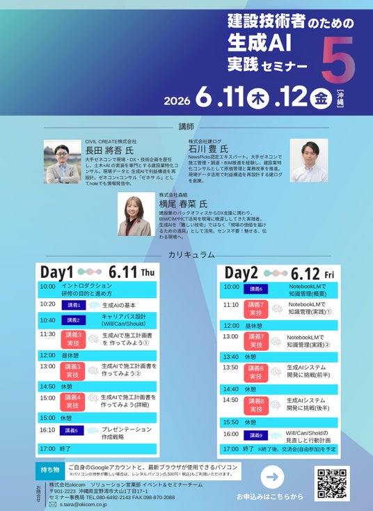 - タイトル:生成AIで施工計画書を爆速作成!建設技術者のための生成AI実践セミナー- 日程:2026年6月11日(木)・12日(金)10:00~17:00(昼休憩含む)