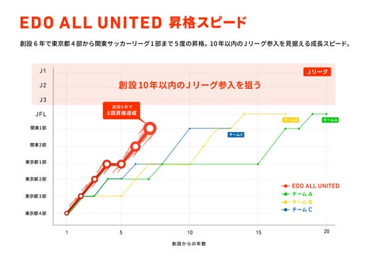 『EDO ALL UNITED』は、「東京から世界一のクラブを目指す」というビジョンを掲げ、2020年の創設からわずか6年で東京都4部から関東サッカーリーグ1部まで5度の昇格を果たしたサッカークラブです。一般的にJリーグ参入まで15~20年を要すると言われる中、10年以内のJリーグ参入を現実的に見据える成長スピードで、大きな注目を集めています。