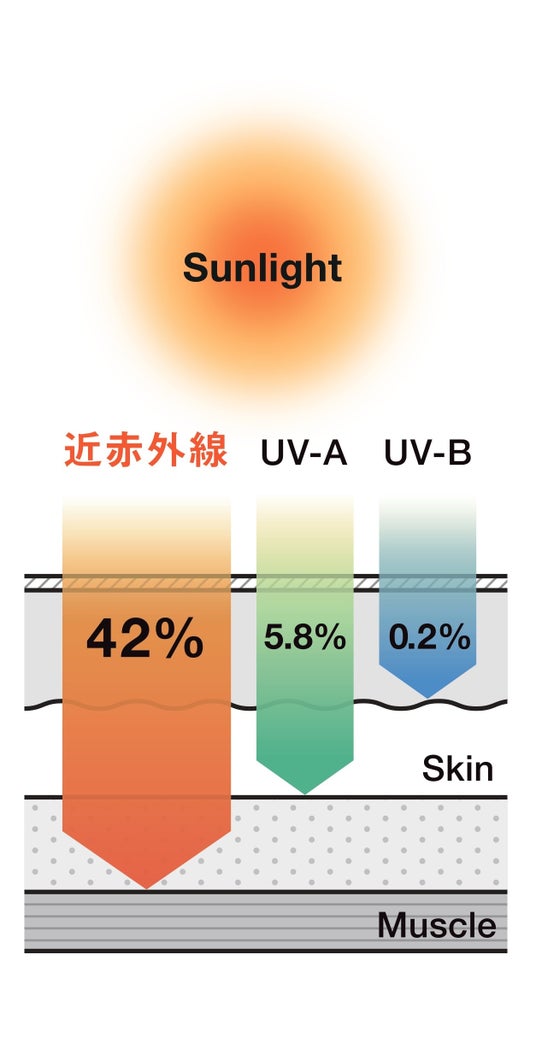 太陽光は、紫外線(UV)、近赤外線(NIR)、可視光線(VIS)などの光エネルギーによって構成されています。従来は紫外線に対するUVケアが主流でしたが、紫外線が地表に届く太陽光のうちわずか6%であることに対し、約42%を占める「近赤外線」は、その波長の長さから肌の奥深くまで到達し、シワやたるみといった光老化の一因となることが近年の研究で明らかになっています。