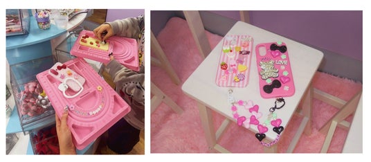 こだわりの内装を施した専用席にて、自分だけのオリジナルアイテムを制作します。キーチェーン用パーツからスマートフォンケース用パーツまで、自由な発想で組み合わせることが可能です。