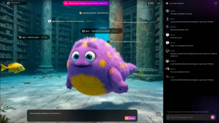 R1は、継続的に配信される共有ライブストリームを通じたマルチユーザー参加をサポートするようになりました。ユーザーは共通のライブフィードにプロンプトを投稿でき、各プロンプトは画面上をスクロールしながらすべての参加者に表示されます。AIがそのプロンプトを取り込むと、共有環境内で即座に動画として表現され、リアルタイムの視覚効果が加わります。ライブチャット機能により、ユーザーは進化し続けるストリームと並行して相互にやり取りでき、参加者と生成プロセスの間に動的なフィードバックループが生まれます。