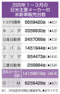 日本車の米販売、6社減 1~3月 駆け込み需要の反動 2026年4月3日 05:00 【ニューヨーク共同】日本の自動車... 残り391文字(全文:408文字) この記事をお読みいただくには「デジタルプラン」または「宅配+デジタルプラン」の会員登録が必要です。無料会員の方はログインしてマイページからコース変更してください。デジタルプランまたは宅配+デジタルプランをご登録中の方はログインしてください。 岐阜新聞デジタル会員に登録すると 無料会員向け記事が読める ニュースレターで最新情報が受け取れる デジタルプラン、宅配+デジタルプランなら Webオリジナルコンテンツが読める 紙面ビューアが読める チケットの先行発売に参加できる お得なクーポンが使える 新規登録ページ ログインページ トップ 岐阜のニュース 日本車の米販売、6社減 1~3月 駆け込み需要の反動 関連記事 骨粗しょう症や腎結石の原因「原発性副甲状腺機能亢進症」健診で発見 ◇ボクシング 松本、巨人で初仕事 逆転直後に降雨コールド ツバメ3連勝 ◇セ・リーグ公示(14日) ◇野球 東都大学リーグ おすすめ記事 「幸せ」を数値で測る時代! 年収1000万円でも満たされない理由とは 高山祭2日目はあいにくの雨 町には祭りの音が鳴り響く 岐阜県での1人暮らし「月27万円必要」 若者の生計費県労連調査 骨粗しょう症や腎結石の原因「原発性副甲状腺機能亢進症」健診で発見
