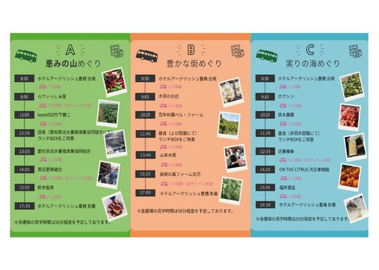 Cコース「実りの海めぐり」では、田原市・豊橋市周辺を巡り、ホクシン(キャベツ)、鈴木農園(トマト)、近藤養蜂(はちみつ)、ON THE CITRUS河合果樹園(レモン、ベルガモット)、福井酒造(日本酒)などを巡りました。