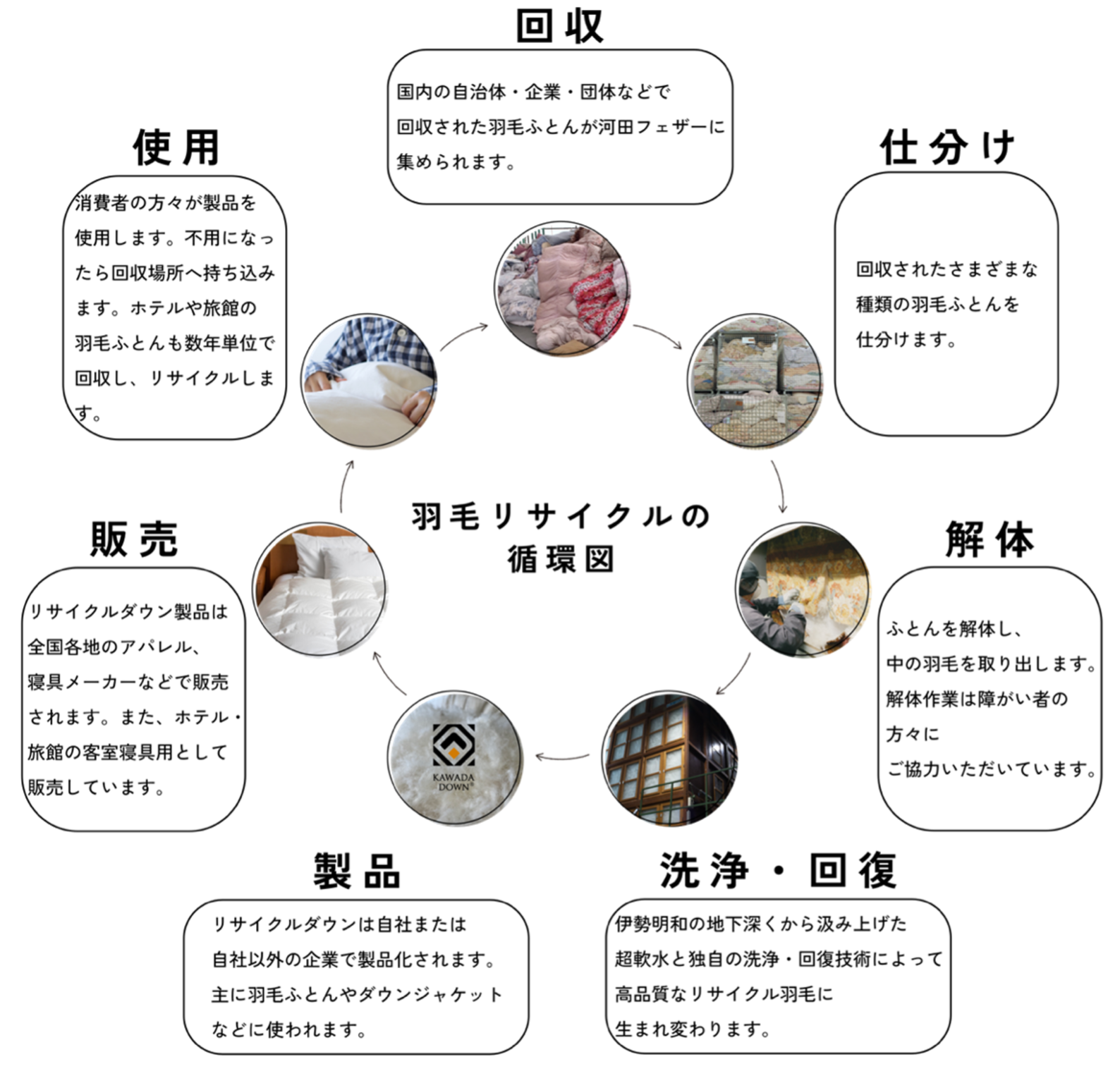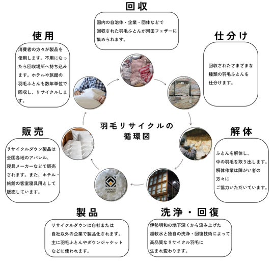 次世代に高品質な羽毛を残すため、当社は全国各地の行政・店舗・団体等にご協力いただき、不用な羽毛製品の回収・リサイクルを行っております。回収した羽毛ふとんは三重県の自社工場で解体、独自の回復加工により高品質なリサイクル羽毛に精製し、国内外のアパレルブランドなどに供給しております。