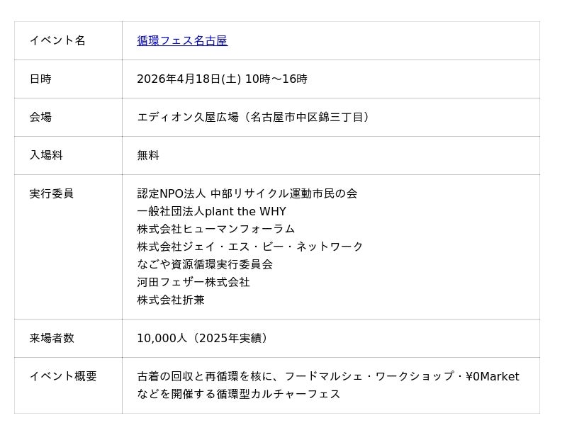 株式会社折兼(本社:愛知県名古屋市、代表取締役:伊藤崇雄、以下「折兼」)、河田フェザー株式会社(本社:三重県多気郡、代表取締役:河田敏勝)、リスパック株式会社(岐阜県岐阜市 代表取締役社長:大松栄太)は2026年4月18日(土)にエディオン久屋広場(名古屋市中区)で開催される「循環フェス名古屋」にブース出展いたします。