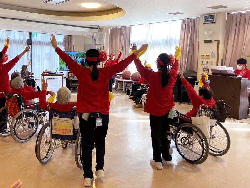 車椅子ダンスクラブの活動日は、若手職員も赤いTシャツ姿で、マイクを持って掛け声をかけたり、エレクトーンを15年ほど習っていた職員が主旋律を引いたり、車いすの利用者の後ろに立って曲に合わせてくるりと回したりして盛り上げています。利用者からは「ストレス発散になって楽しい」などの声が上がります。若手職員は「踊っているときは普段よりも生き生きとした表情をしていて、良い刺激になっていると感じます。今後は自分たちで考えた振り付けを入れるなどしてもっともっと盛り上げていきたい」と話しています。