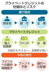 プライベートクレジットは、銀行を介さずに企業に直接資金を貸し出す非公開市場の融資。08年の金融危機後の規制強化を受け、銀行がリスクの高い融資を手がけにくくなったことを背景に拡大したものの、流動性は低い。近年は高い利回りを背景に富裕層以外の個人投資家も取り込んだが、債務不履行を受けて投資家の見方が変化し、資金引き揚げの動きが出ている。