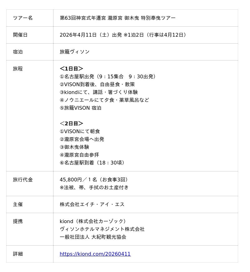 株式会社カーゾックが運営するkiond(所在地:三重県多気町/本社:愛知県名古屋市、代表取締役社長:栗林 由幸)は、ヴィソンホテルマネジメント・一般社団法人大紀町観光協会との共同プロジェクトとして、2026年4月11日(土)、4月12日(日)に「第63回神宮式年遷宮 瀧原宮 御木曳 特別奉曳ツアー」を開催します。