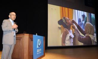 講演では、空爆されるガザの様子や重度の栄養失調に苦しむ子どもの写真をスクリーンに示し「上腕の太さが大人の親指ほどしかない赤ん坊の姿を目の当たりにした」とし、栄養治療が喫緊の課題だと指摘した。