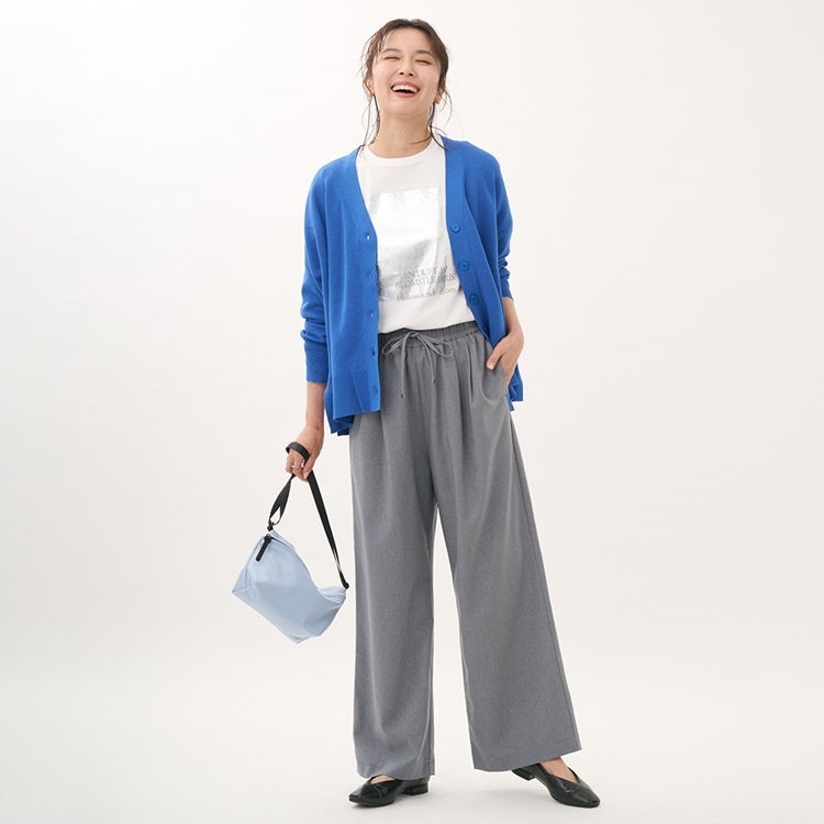 あわせて、同素材の「リネンライクブラウス」も登場。前開き仕様のため羽織としても使え、デイリー使いに最適です。また、リラックス感が魅力のトレンドアイテム「ギャザーワイドパンツ」を合わせると大人のリラックスコーデが完成します。抜け感のあるパンツは、軽くてシワになりにくいドライポリ素材を採用しました。程よくワイドなシルエットにウエストはオールゴム仕様とすることで、リラックス感のある着心地です。いずれも「すごナノ撥水」機能を備え、汚れを気にせず軽やかに春の装いを楽しめるアイテムです。