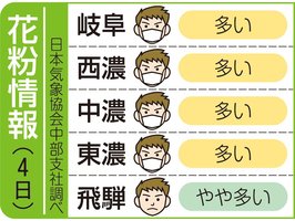 岐阜県内の花粉情報(4日) 2026年4月4日 08:28 岐阜県内の花粉飛散度は、以下の通り... 残り123文字(全文:140文字) この記事をお読みいただくには「デジタルプラン」または「宅配+デジタルプラン」の会員登録が必要です。無料会員の方はログインしてマイページからコース変更してください。デジタルプランまたは宅配+デジタルプランをご登録中の方はログインしてください。 岐阜新聞デジタル会員に登録すると 無料会員向け記事が読める ニュースレターで最新情報が受け取れる デジタルプラン、宅配+デジタルプランなら Webオリジナルコンテンツが読める 紙面ビューアが読める チケットの先行発売に参加できる お得なクーポンが使える 新規登録ページ ログインページ トップ 岐阜のニュース 岐阜県内の花粉情報(4日) 関連記事 岐阜県内・桜の開花状況 一覧(4月3日夕 本社調べ) 飛騨地域初の四年制私立大学CoIUが開学 1期生、夢を胸に入学式 恵那市の国道19号で3台絡む事故 80歳男性が病死か 岐阜市の「道三まつり」、雨予報で一部の予定変更 飛騨地域に春の訪れ 飛騨一宮水無神社で生きびな祭 大野町で国天然記念物「揖斐二度ザクラ」が満開 花の中に新しいつぼみ おすすめ記事 中東不安、岐阜県内産業に影響「車部品減産、長期化は問題」「プラ原料の取り合い」 【スコア速報】第43回岐阜オープンクラシック2026開幕 プロ・アマ頂上決戦 岐阜県の鳥「ライチョウ」今後の保全策とは 11日に環境省報告会 人気絵本「ペネロペ」原画展 多治見市、仕掛け絵本の試作品など並ぶ