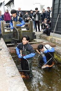 飛騨市古川町の白壁土蔵街を流れる瀬戸川で4日、近くの池で越冬したコイを川に戻す作業が行われた。“コイの引っ越し”は飛騨古川の春の風物詩になっており、市民や観光客が見守る中、大小1192匹のコイが放された。
