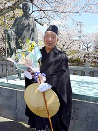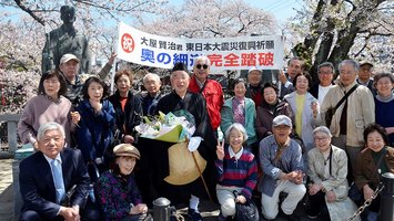 江戸時代の俳人松尾芭蕉の俳諧紀行「奥の細道」の道のりを主に歩いてたどっていた大垣市出身の大屋賢治さん(76)=福島県郡山市=が、大垣市船町の奥の細道むすびの地に到着し、15年がかりで約2400キロの全行程を踏破した。古里とあって、小中高の同窓生20人余りが出迎え、達成を祝福した。