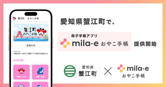 自治体向けサービスを開発する株式会社ミラボ(本社:東京都千代田区、代表取締役:谷川一也、以下「ミラボ」)の母子手帳アプリ「mila-e(ミライー) おやこ手帳」が、愛知県 蟹江町に導入され、「蟹江町おやこ手帳」として 2026年4月6日より提供を開始します。