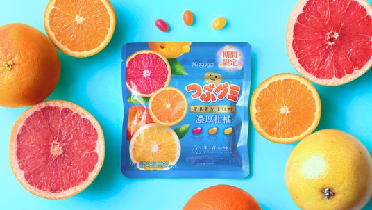 「つぶグミPREMIUM」の柑橘フレーバーは大変好評をいただいております。2022年の秋に発売し、2024年には夏仕様で販売。多くのお客様からご好評をいただきました。今回はそんな柑橘フレーバーを装い新たにお届けします。一袋にピンクグレープフルーツ味、バレンシアオレンジ味、グレープフルーツ味をミックスしました。濃厚さの中にも爽やかさを感じられる味わいで、3種の柑橘の味の違いをお楽しみいただけます。柑橘をより深く楽しめるパッケージ