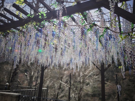 ■クリスタルガラスの藤の花 ~グリチネ~庭園では、約7万7千粒のクリスタルガラスを使用した「藤の花」が展示中。初夏の風と木漏れ日に揺れる、自然のシャンデリアのような輝きをお楽しみください。