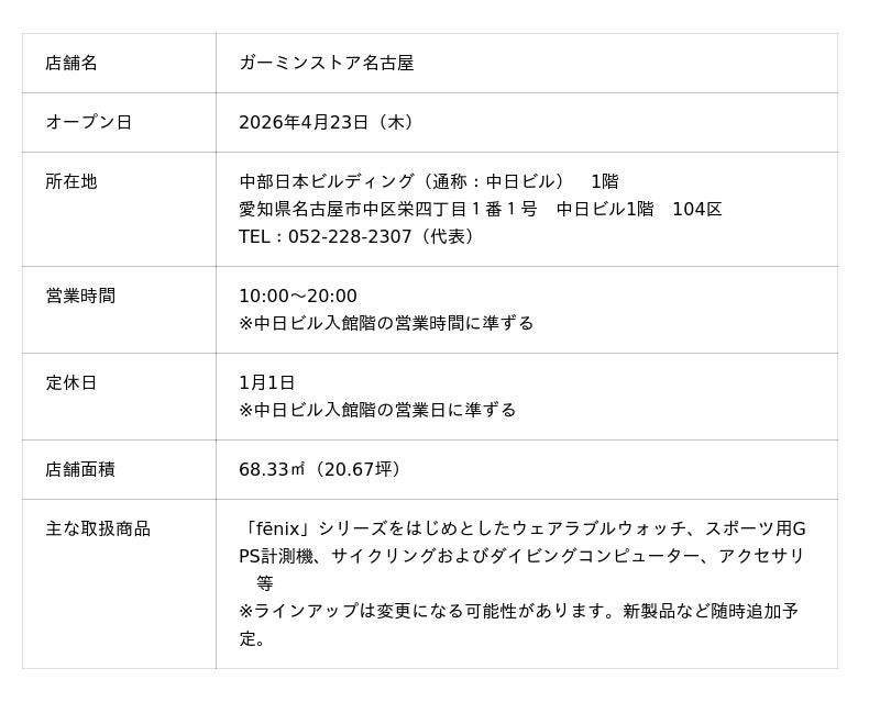 アメリカ発データ活用のプロフェッショナル、ガーミンジャパン株式会社(以下、Garmin)は、愛知県 名古屋市最大級のビジネス&商業エリアである栄のランドマーク施設「中部日本ビルディング(通称:中日ビル)」に、ブランド直営店「ガーミンストア名古屋」(名古屋市中区栄四丁目1番1号 中日ビル1階)を、2026年4月23日(木)にオープンします。
