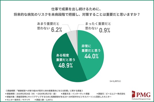 「仕事で成果を出し続けるために、将来的な病気のリスクを未病段階で把握し、対策することは重要だと思うか」と尋ねたところ、約9割が『非常に重要だと思う(44.0%)』『ある程度重要だと思う(48.9%)』と回答しました。