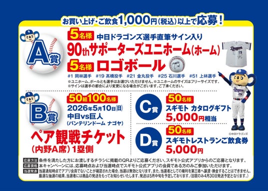 杉本食肉産業株式会社(本社:愛知県名古屋市、代表取締役:杉本匡彌 通称:お肉の専門店スギモト)は、日頃のご愛顧への感謝を込めて、2026年4月6日(月)より、豪華賞品が当たるキャンペーン「お肉で幸せと感動を!スギモト ジャストミート祭!」を開催いたします。期間中、スギモト店舗のご利用のご応募で中日ドラゴンズ公式戦観戦チケットや選手直筆サイン入りグッズなどが当たる企画と、公式アプリからどなたでもご応募いただける「バンテリンドームナゴヤでの始球式権と観戦チケットが当たる」企画を同時に開催いたします。
