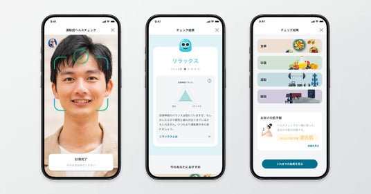 スマホカメラで顔を撮影するだけで、顔色や脈波から「活力度」や「自律神経バランス」などを解析し、「今日の体調」を可視化します。