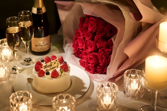 【プラン内容】お食事、窓側席確約、乾杯酒、9cmのショートケーキ、21本のバラの花束