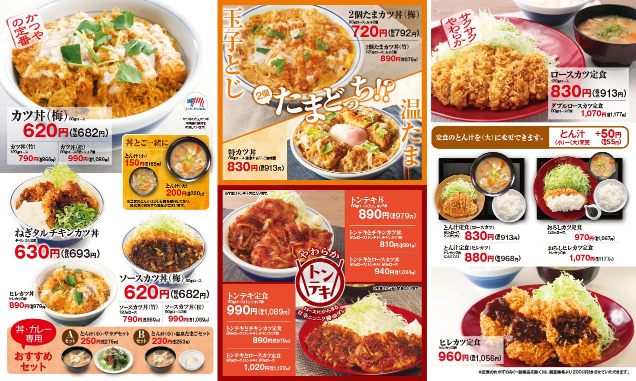 定番メニューの「カツ丼(梅)80gロース」は620円(税込682円)。定食メニューで人気の、サクサクな⾐とやわらかなお肉を味わえる「ロースカツ定食 120gロース」は830円(税込913円)と、お手頃価格で「とんかつ」を楽しめます。